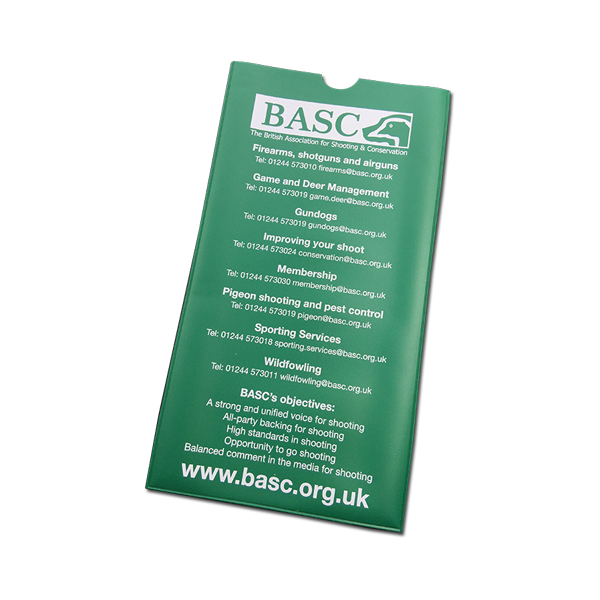 This outer side of the green panel on this wallet has been screen printed in one colour, white, with contact information for various BASC departments.